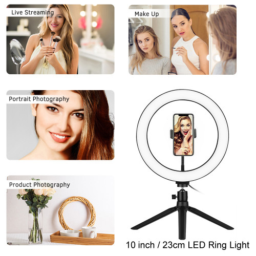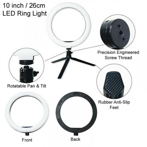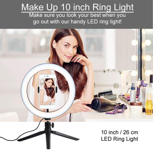 10 inch LED Ring Light with Tripod Stand & Phone Holder. Ideal to fill in shadows and provide additional lighting for Zoom video calls etc. This 10" make up ring light kit comes with a ring light, a selfie tripod, a phone holder and you can adjust the light using the control which is part of the USB cable.