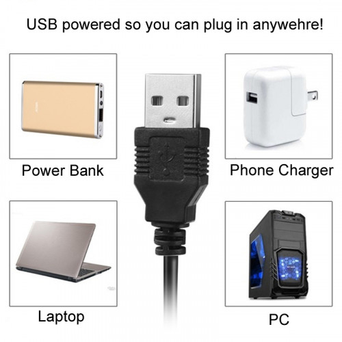 - USB Powered, no battery needed. Equipped with a cable, the 5V USB interface can be plugged into any devices containing a USB port such as laptop, mobile power bank etc. The on/off switch and controller for the light type and brightness is part of the USB cable.