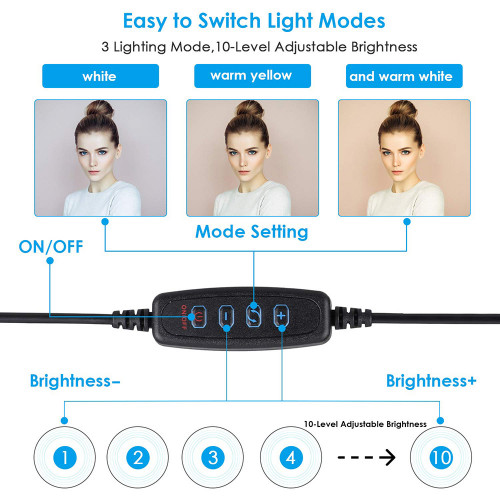 - 10 inches LED ring light with 3 colour modes (white, warm white and warm yellow) colour temperature range is 3500-6000k. The brightness of each colour mode can be easily adjusted in 10 levels by the remote controller. Selfie ring light takes away all the unflattering shadows to highlight you and darken everything behind you.